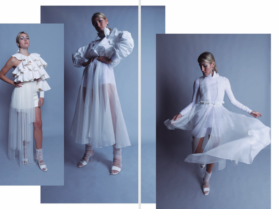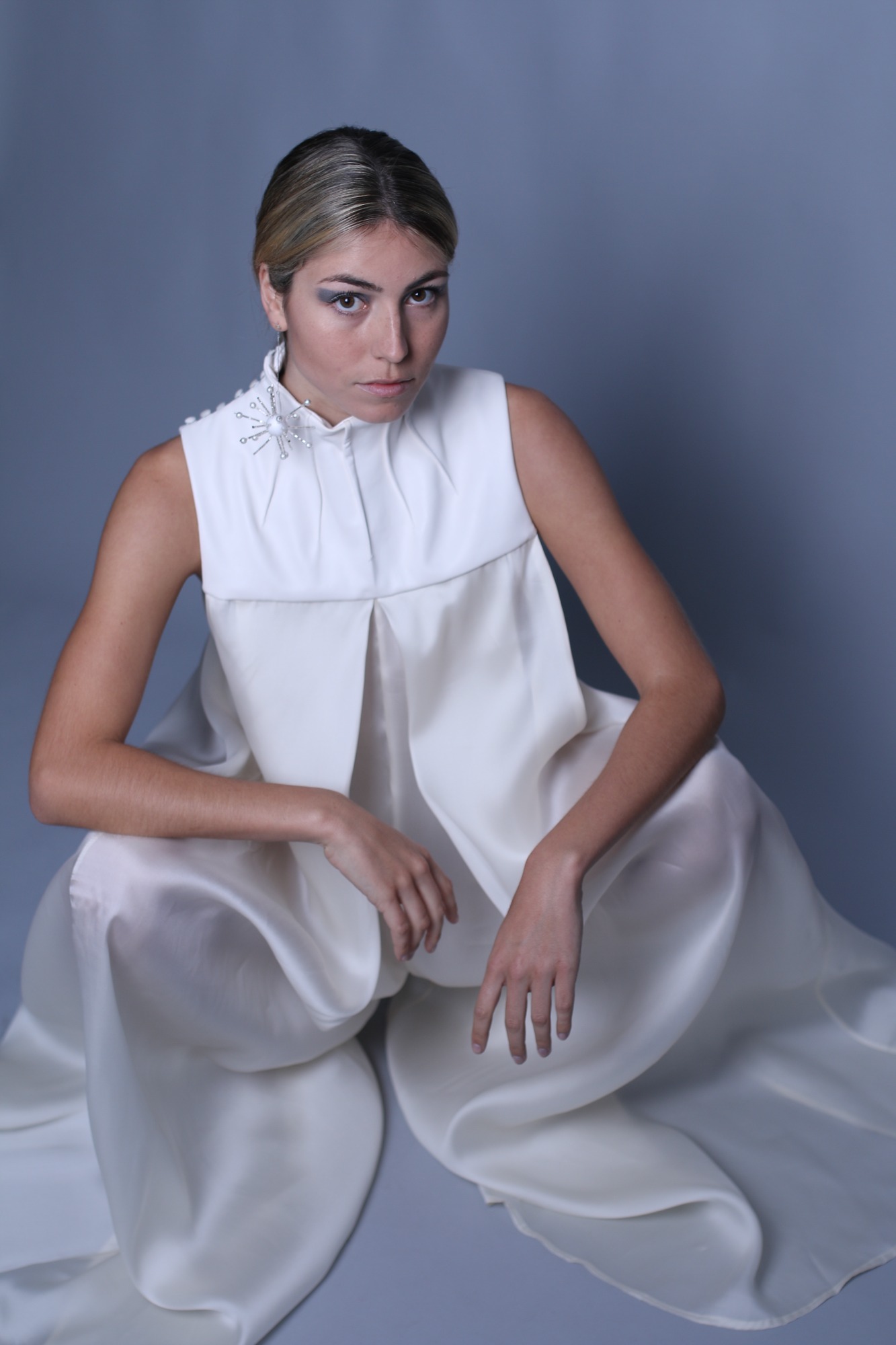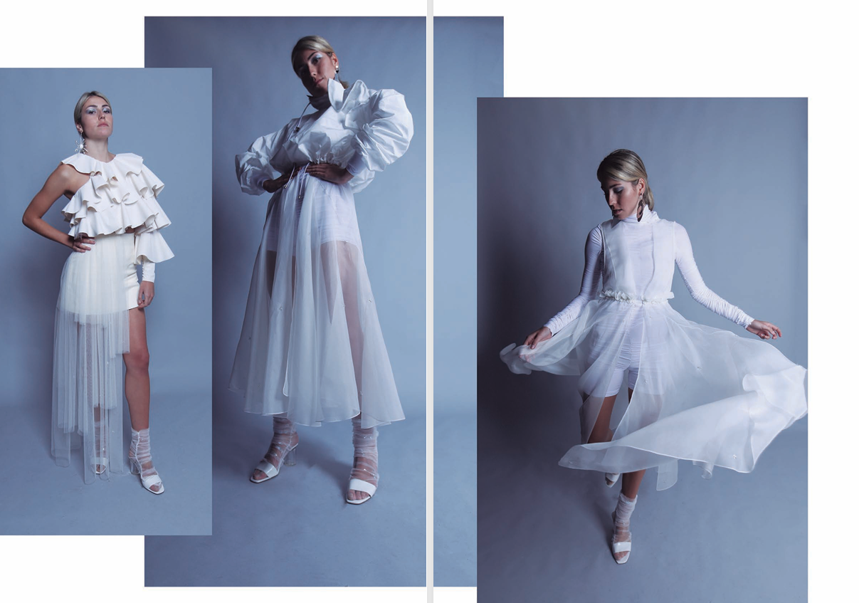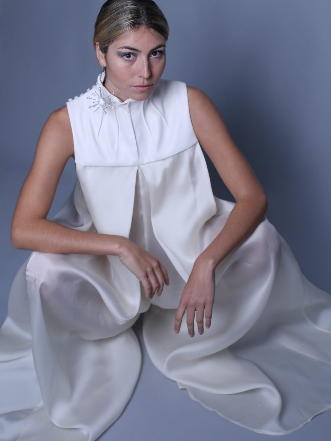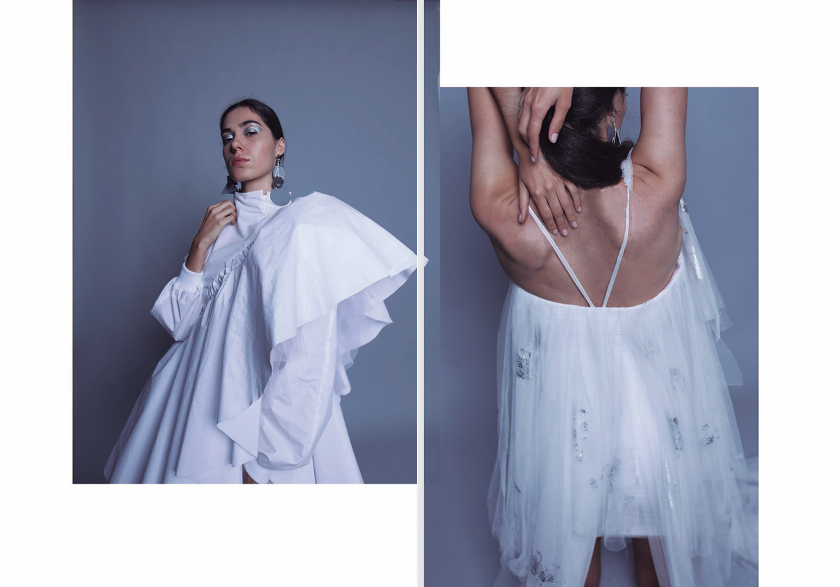Los looks están formados por tejidos de gran calidad, que juegan en tonalidades de blanco y brillo, aportándoles luz y profundidad.