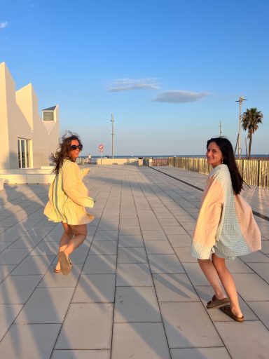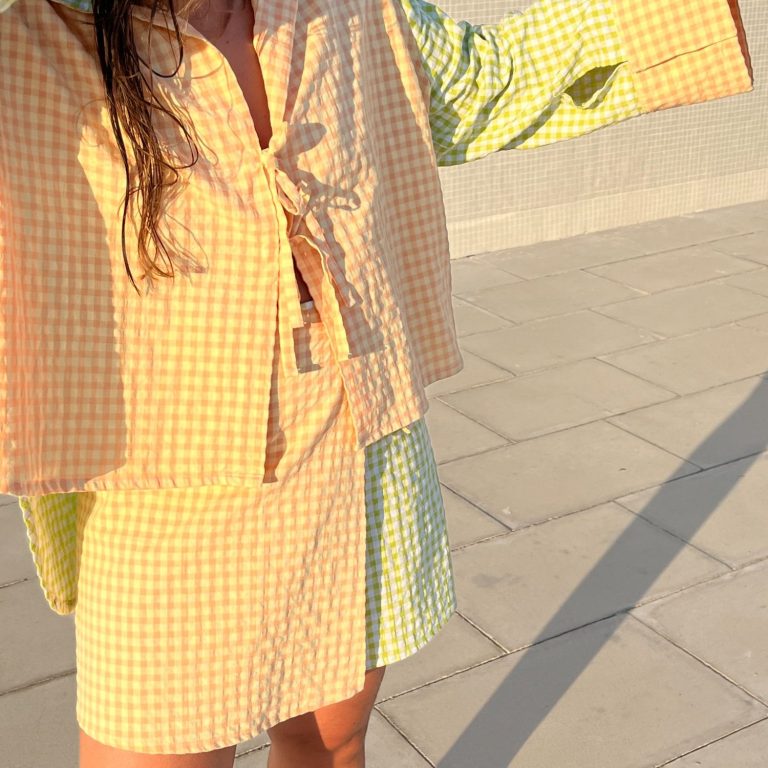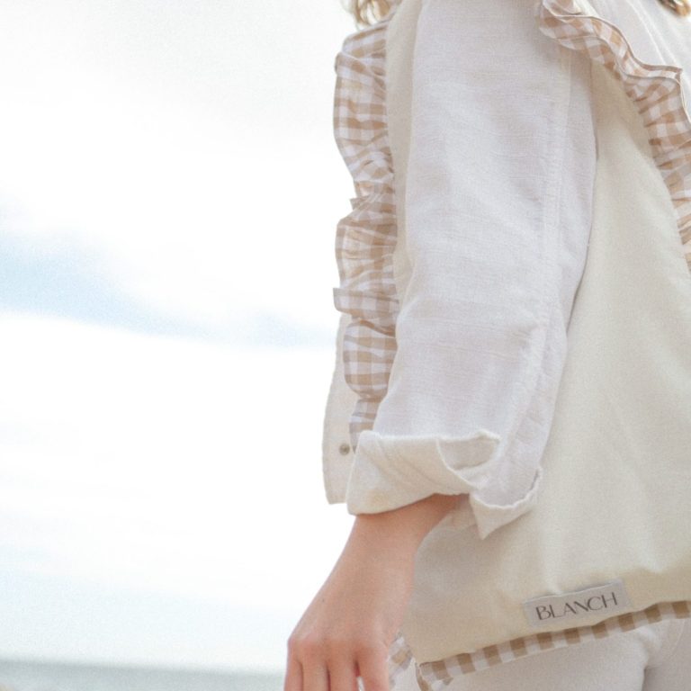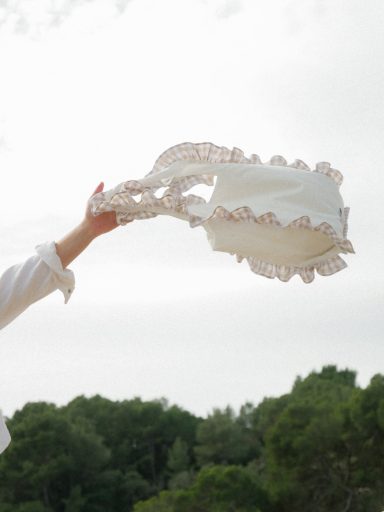 Con volantes de tejido vichy marrón/beige alrededor del bolso.