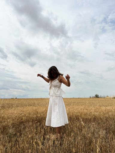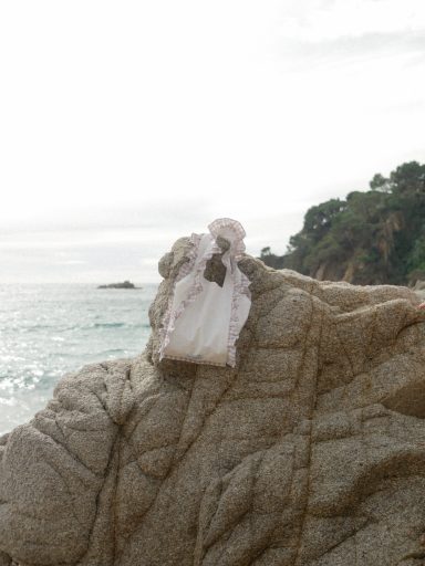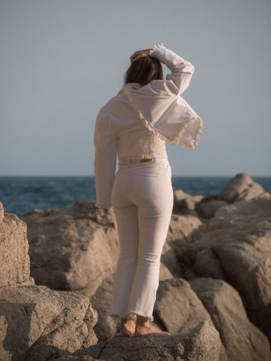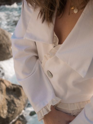 Abierta por delante, con cuello camisero y corte trasero. Frunce en la parte superior de la manga y volante que recorre todos los finales de la chaqueta y el centro espalda.