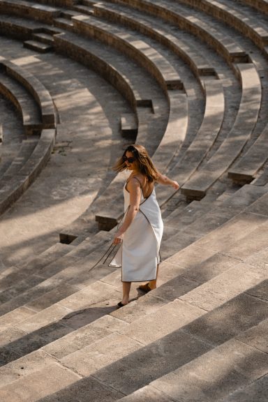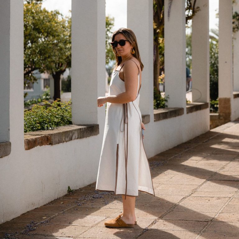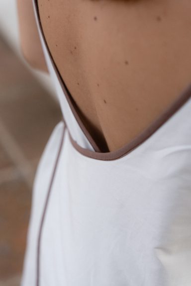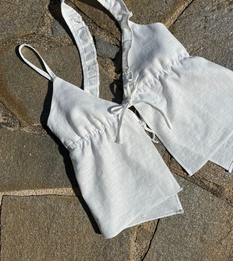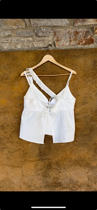 Escote pico con volante en un lado, que va del escote a la espalda, pasando por el tirante.