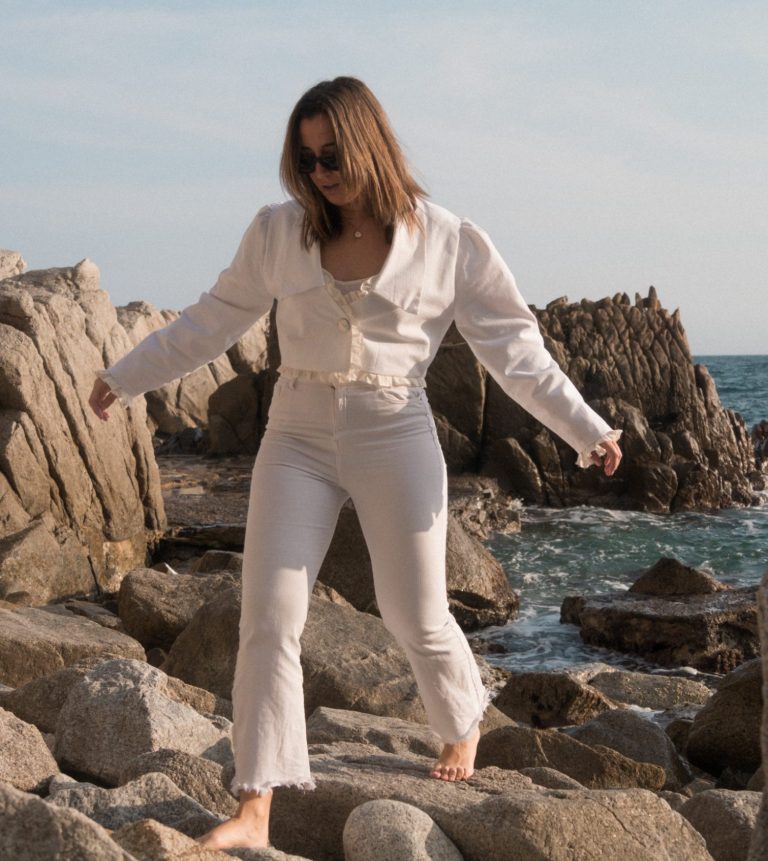 Chaqueta corta de tejido de algodón y botón de nácar.