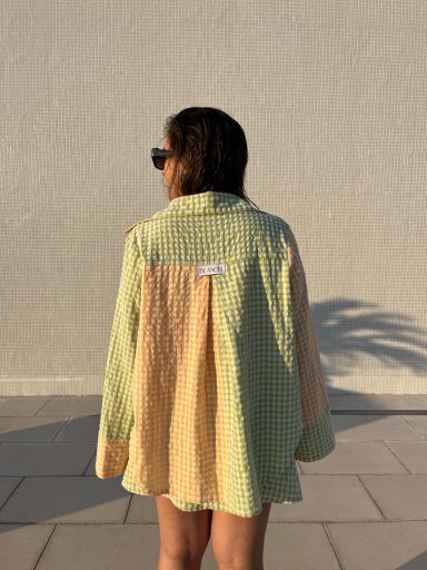 Camisa de manga larga y ancha con cierre de botones de presión. Cierre delantero con lazos y botón superior. Pliegue en la espalda y largo asimétrico.