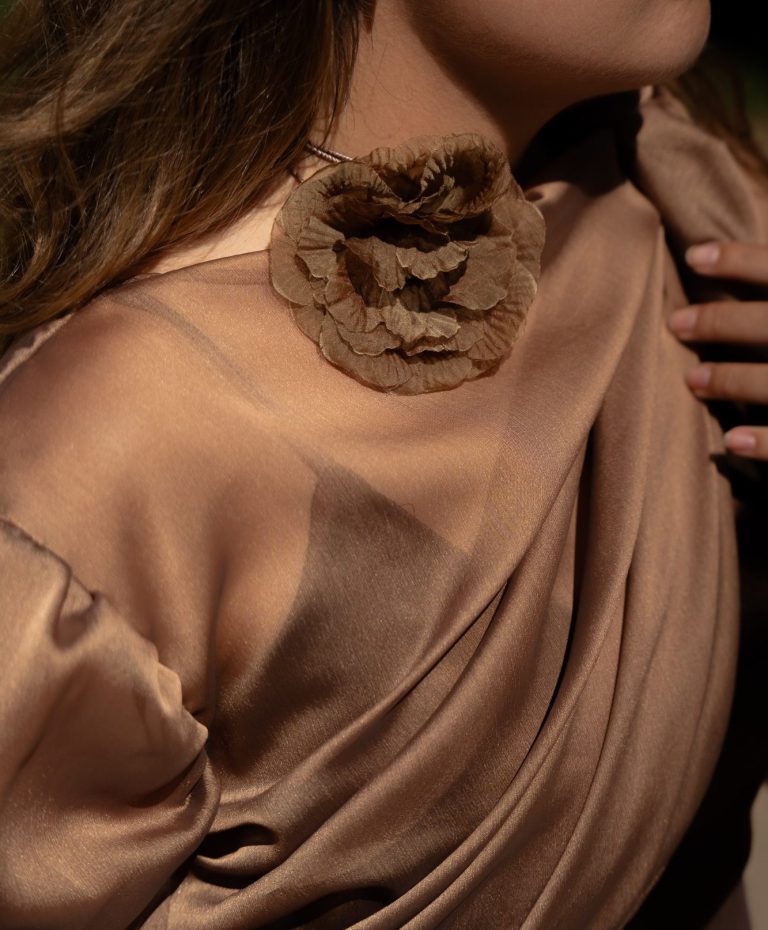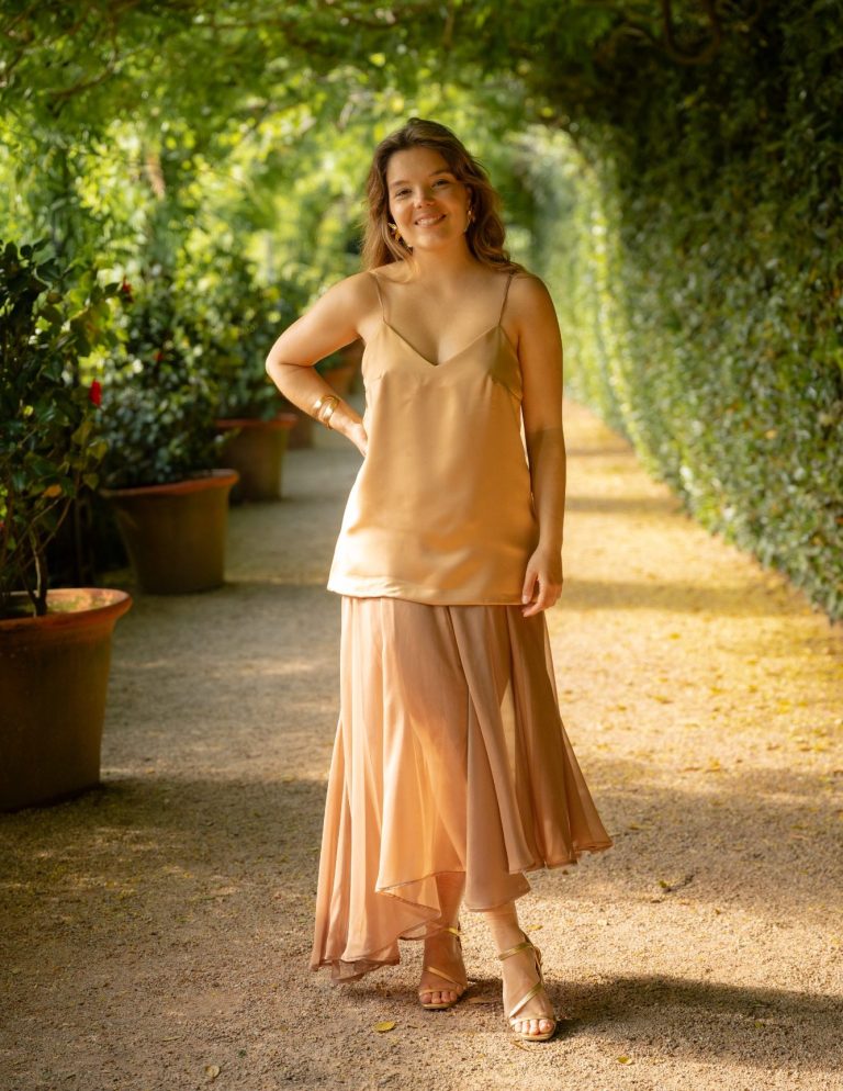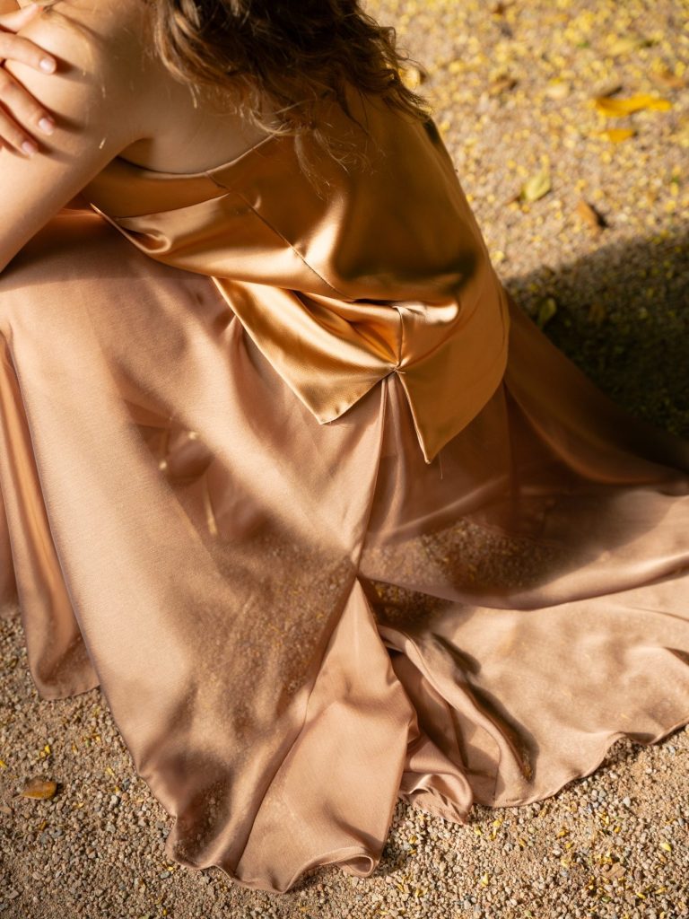 Vestido de tirantes, escote pico y espalda descubierta; de satén color marrón claro y falda de gasa tornasol, con vuelo a base de godets.