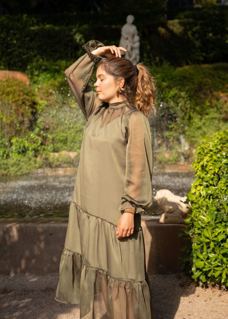 Doble vestido: Base de tirantes, escote pico y espalda descubierta. De crespón color verde claro. Capa superior de gasa tornasol verde oscuro. Cerrada al cuello con un lazo, manga larga, espalda descubierta y fruncido en cuello.