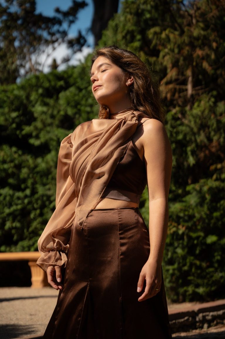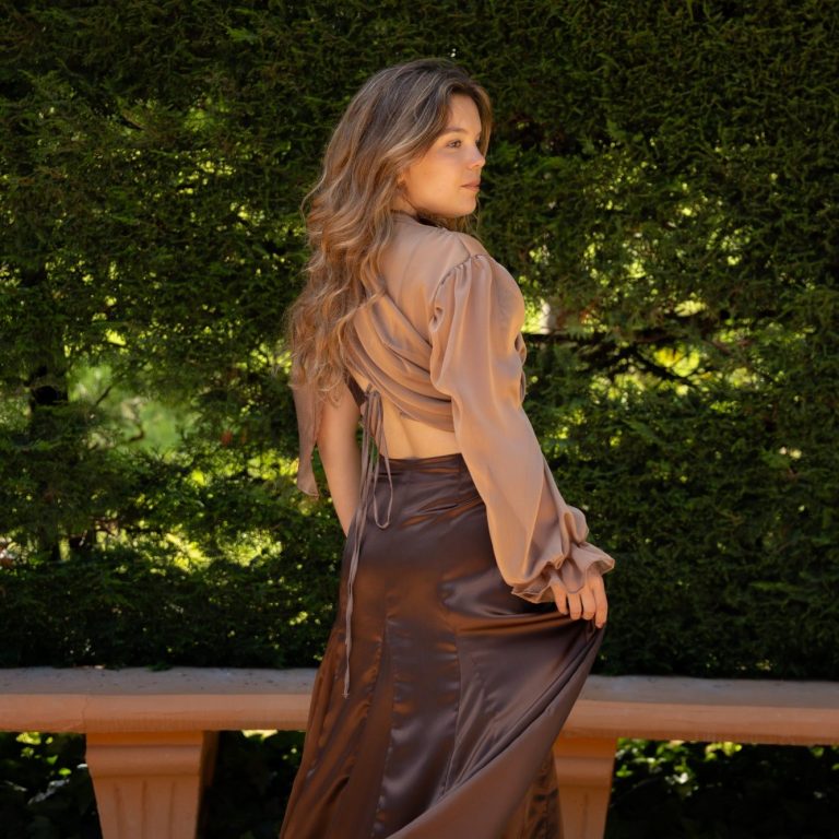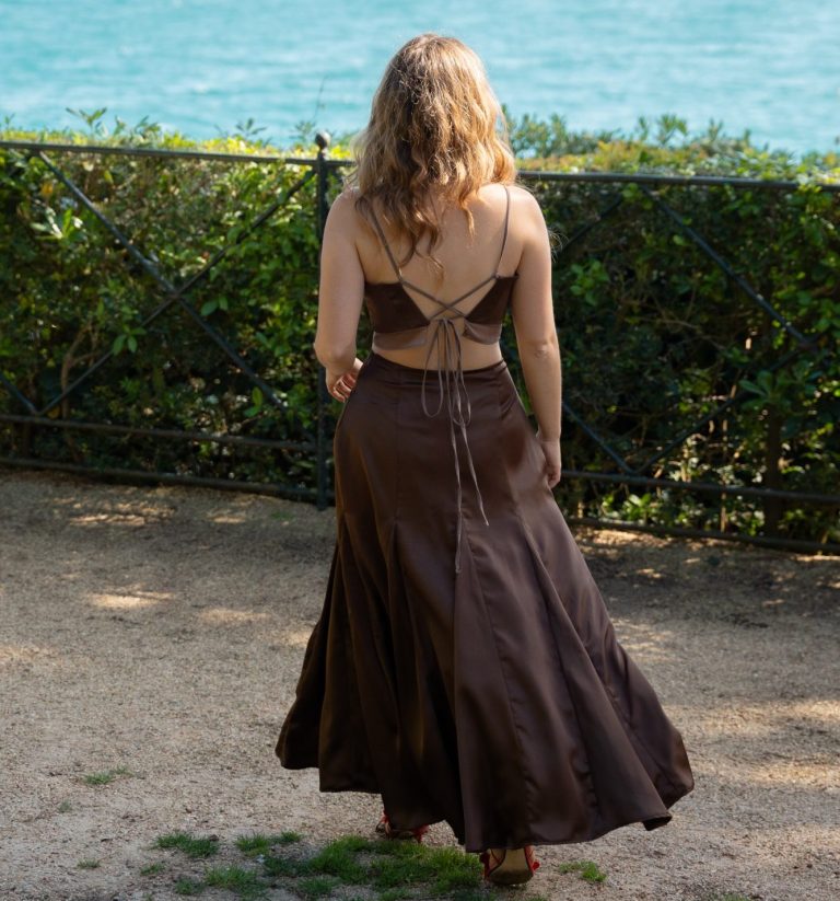 Dos piezas con top de tirantes, escote pico y espalda descubierta, de satén marrón oscuro y detalles de gasa; y falda larga con vuelo a base de godets.